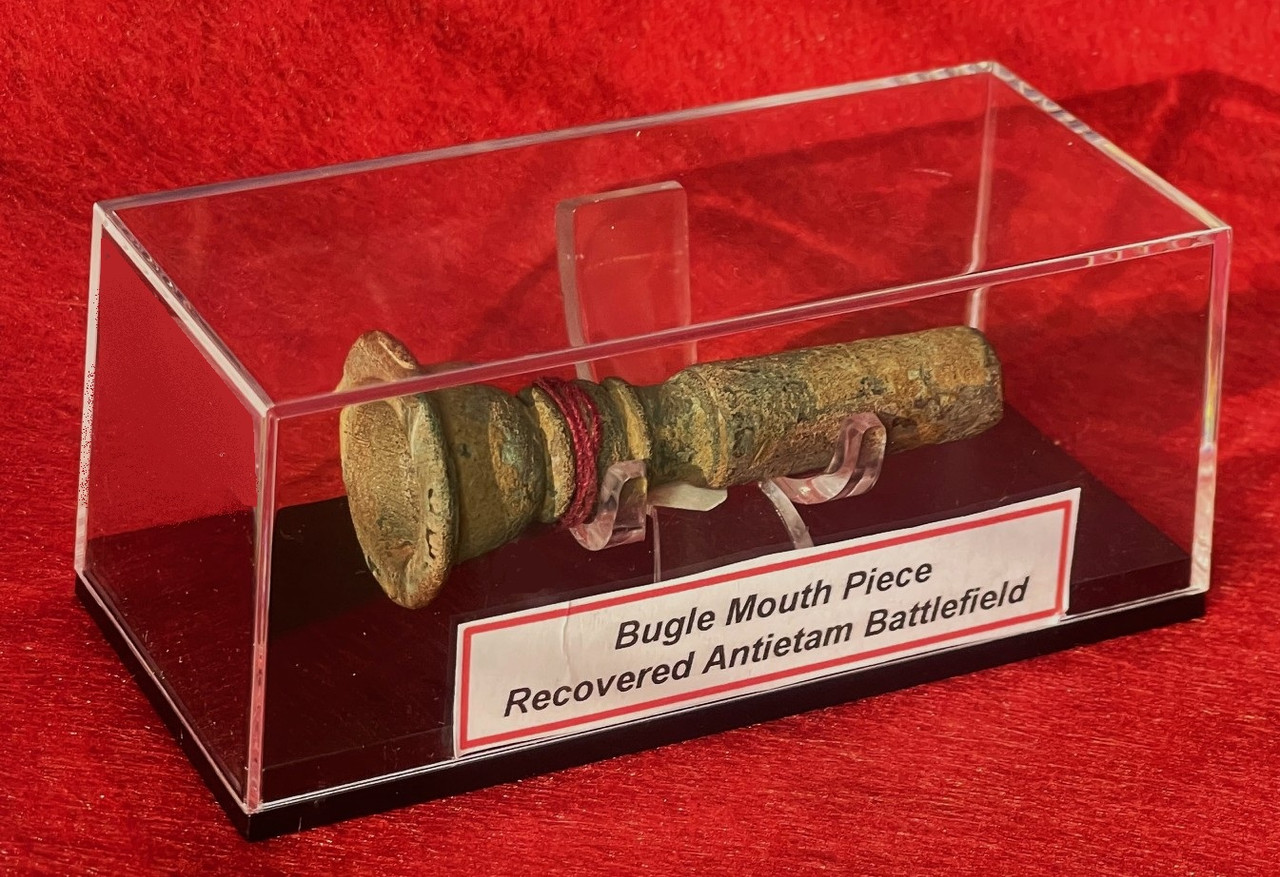 Civil War Buglers were highly respected and always in demand and there were a lot fewer of them than drummers and fifers. There are bugle mouth pieces in just about all of the Civil War dug artifacts books. In the recent book “Groundbreakers”, by Steve Sylvia, there is a very similar example of this mouthpiece (see pictures). This artifact is in very nice condition and is just as found, only the dirt cleaned off. It comes in the acrylic display case pictured. No one will ever know if this bugler survived the battle.