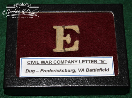 This is another nice piece being offered from the Fredericksburg Battlefield relic collection I recently acquired, it is a Hat insignia, Regulation 1851, Company “E”, large size, approximately 1”. Lettered hatpins were used to designate companies, this one would have had a die struck brass pin wire loop fastener for sewing onto the hat (long gone). It was recovered during the 1960s - 1970s from the Fredericksburg, Virginia Battlefield.