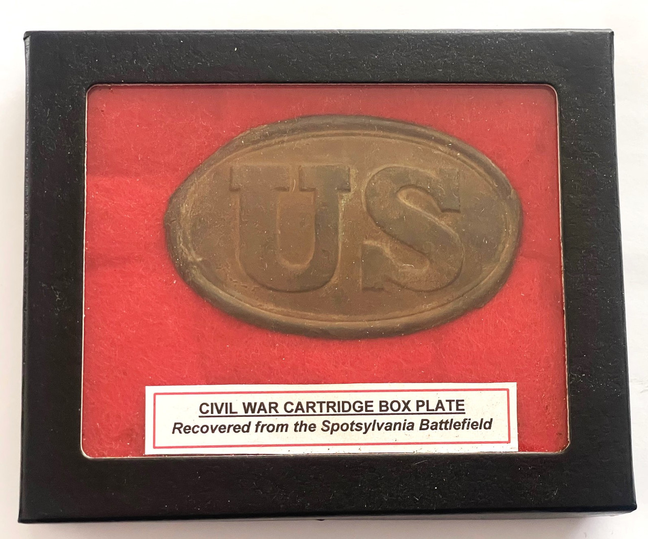 The brass front of this plate has an absolutely beautiful even dark brass patina. It is nearly flawless. Any relic from this area of the Spotsylvania Battlefield has always been highly desired. It comes in the glass top display case pictured. This is a great piece of history from a brutal Civil War battle.