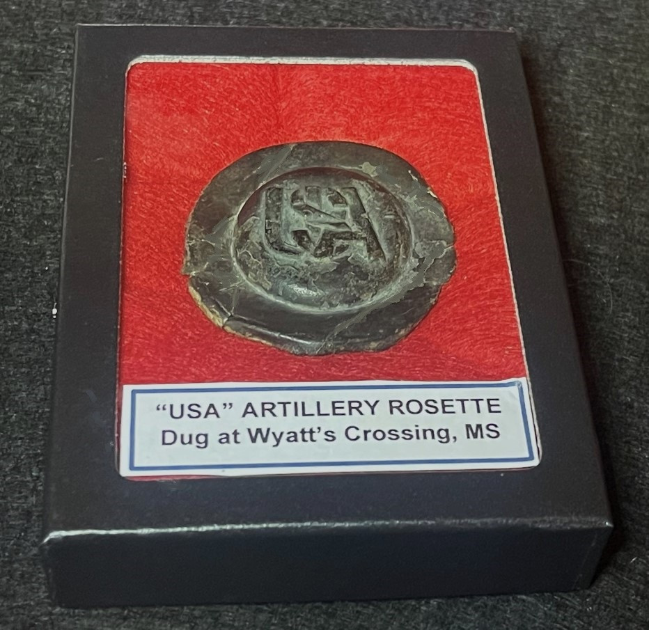 This is another nice piece being offered, it is an excavated bridle rosette with the raised intertwined letters "USA" and has a 2” diameter. It was dug in a Union camp at Wyatt's Crossing [Waterford] Mississippi, many years ago by Gene Ingram. This camp was way off the beaten path, and he was the first one to discover it.
