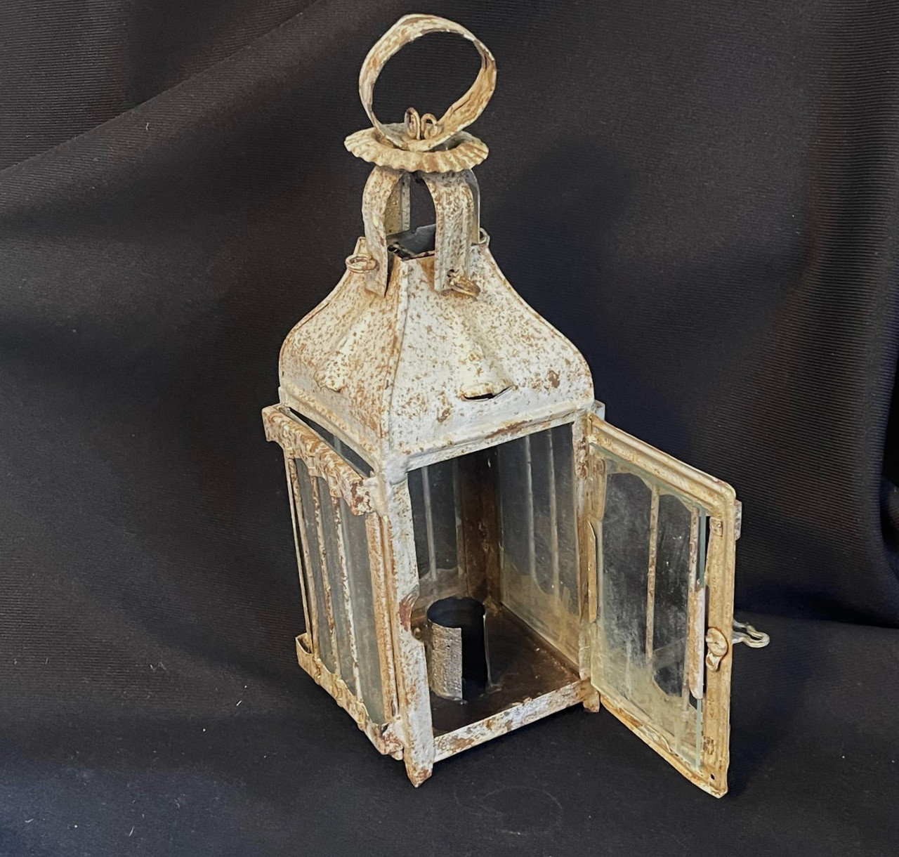 It does appear that it was originally painted silver, but now it is worn and there is some surface rust but nowhere rusted through. As typical with these early lanterns, some of the glass may have been replaced. These lanterns are often seen in period photographs of camp scenes. This lantern would look great in a Civil War camp scene.