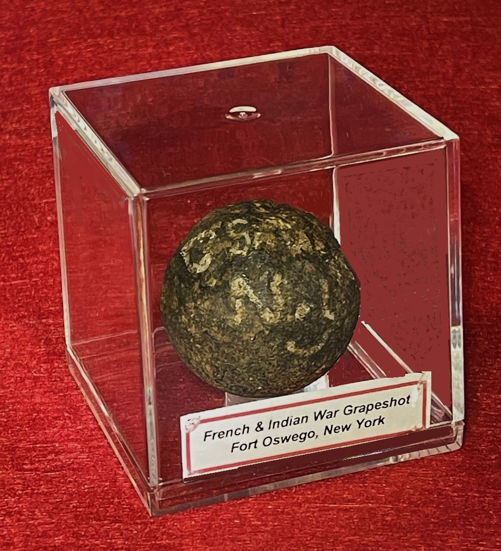 The ball remains in very nice condition, having some overall roughness, but no chipping or flaking. This collection began in the late 1950s and was created by private acquisitions, closed museums, and from lake divers. The collector meticulously displayed and cataloged every piece along with its provenance. Fort Oswego played an important role in early American history. It comes in the acrylic display case pictured.