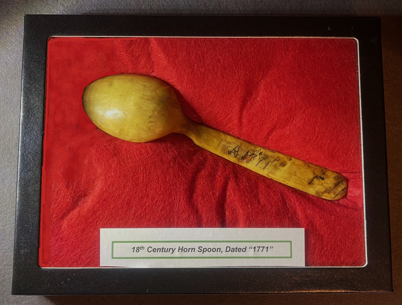 Being offered is a carved spoon from a Revolutionary War collection I acquired. The spoon is carved from horn and measures 6 ¼” long and the bowl 1” wide. Carved into the handle is the letter “A”, followed by the date “1771”.
