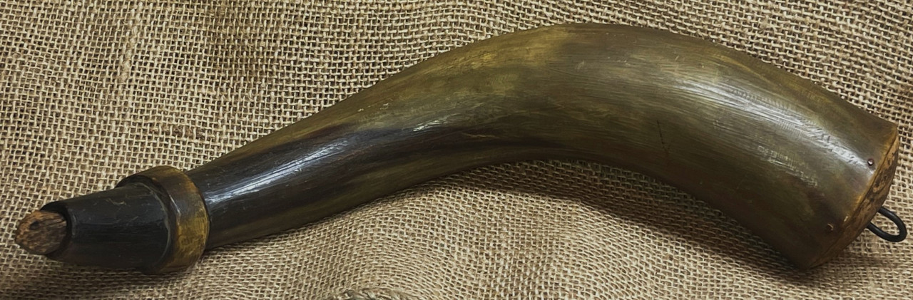 Powder horns were generally created from cow, ox, or buffalo horn. To close off the wider end, there are tiny metal tacks fastened to the wooden block. The smaller end has a small wooden stopper to keep it from spilling.