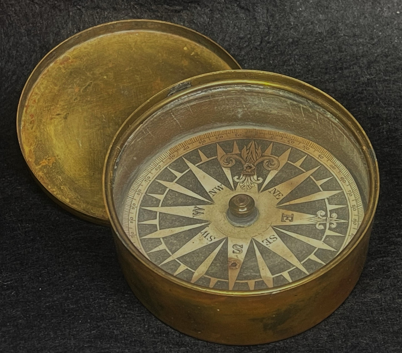 This is a very good example of a compass used on boats and ships. It is rare to find both upper and lower parts to the outer case – most of them are missing the lid. The uncleaned case is slightly worn though essentially undamaged condition, the card remains crisp, very easily finding the north mark.