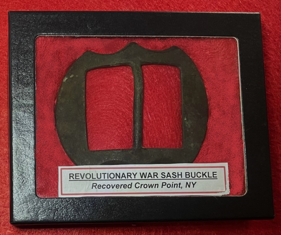 In the Revolutionary War section of Howard Crouch’s relic book, he shows one of these buckles and states “A very heavy brass-cast sword sling buckle. By their bulk alone, the civilian usage of such buckles can be eliminated” (see pictures). There is another in the Fort Plain Revolutionary War Museum (see pictures). It is in very nice condition, indicative of an early recovery. It comes in the glass top display case pictured.