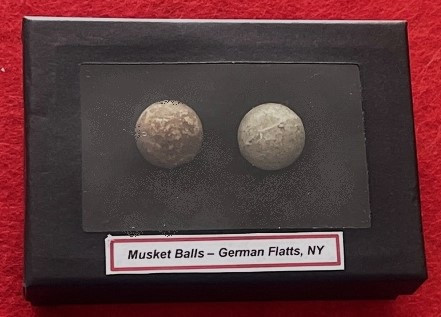 Being offered are two Revolutionary War musket balls, being .69 caliber, most typical of the era. They are part of a cache of boxed dug artifacts that were identified and put into separate boxes 50+ years ago. They were recovered at the Battle of German Flatts, NY.