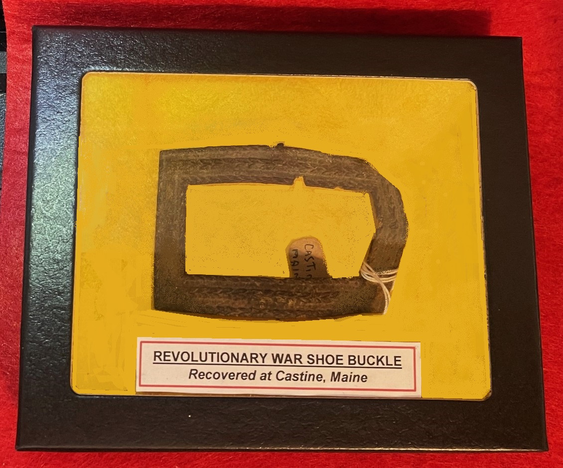 This is another nice piece being offered, it is an excavated Revolutionary War soldier’s shoe buckle – could be American or British. It is made of brass and measures 3” x 2”. This one was recovered at Castine, Maine and lost during the Penobscot Expedition.