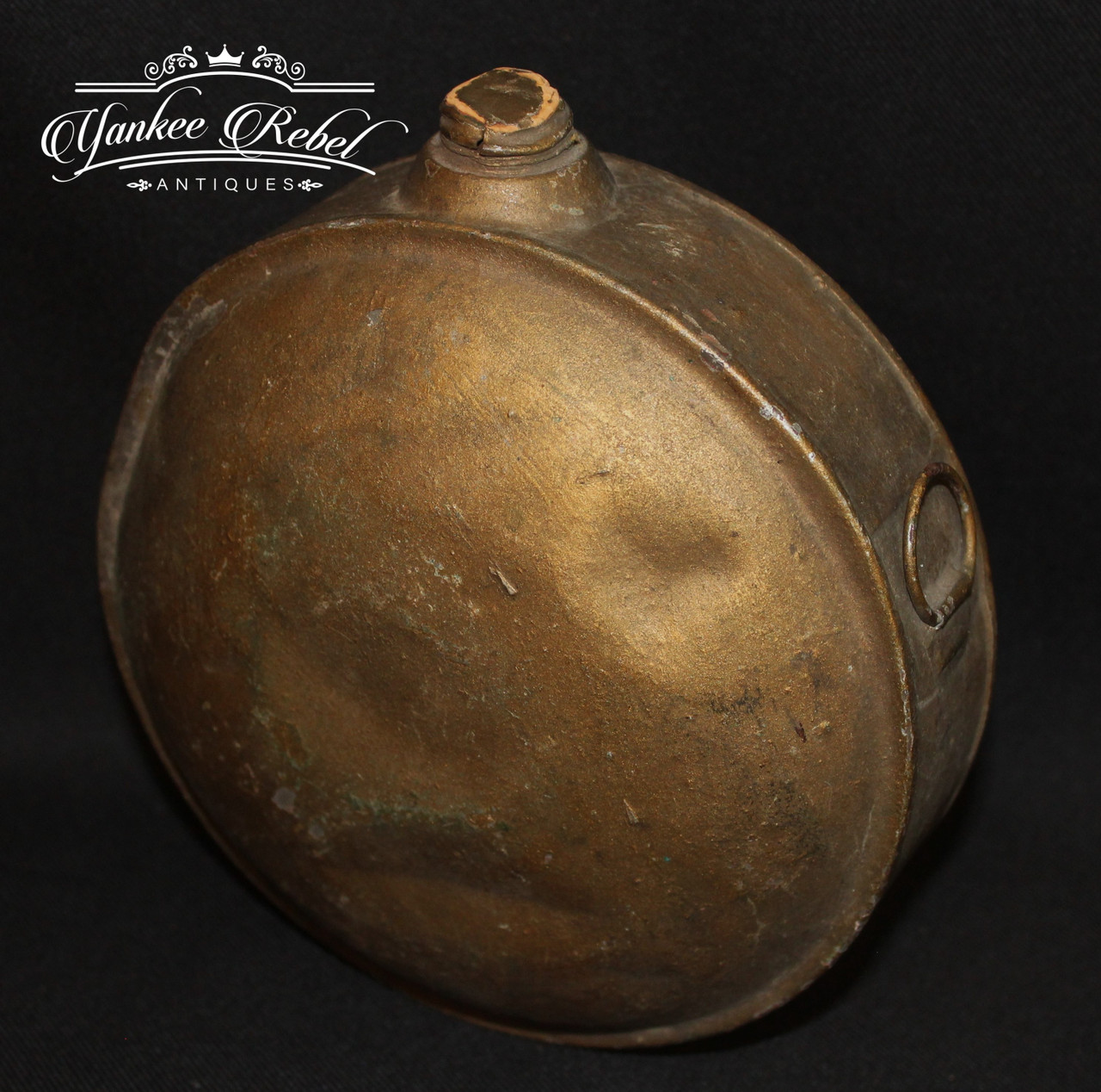 This is another great canteen being offered, it is an early 19th century tin Militia Canteen. It has a diameter of 6 1/2” x 5 3/4” wide. It has 2 triangular sling keepers that are soldered in place, and it appears to have its original stopper. The convex sides are very pronounced along with some minor dings and dents.