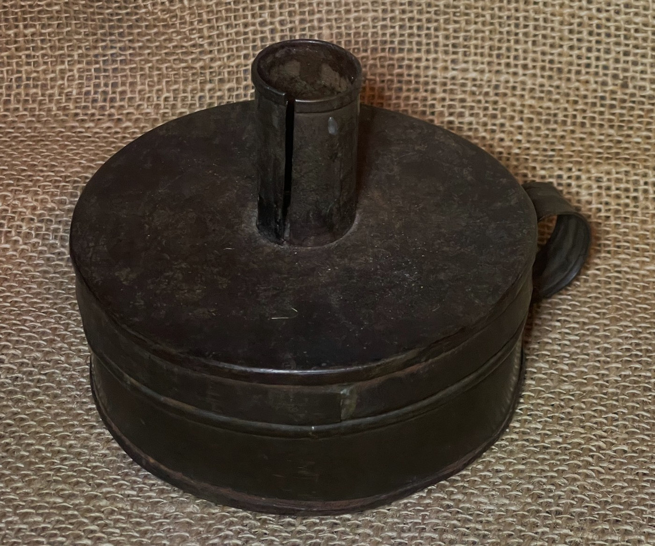 This is another nice piece being offered, it is a Revolutionary War Tinderbox, circa 1755 – 1790. It is made of tinned iron with a candle sleeve on top and is complete with the interior damper/snuffer, flints, and striker . It has a diameter of 4 1/8” x 2” tall (not including handle and candle sleeve).