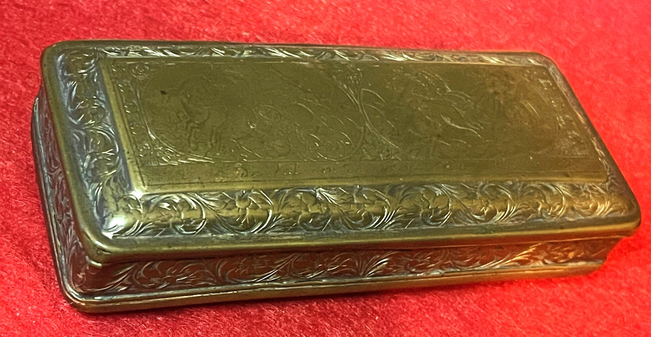 Being offered is a rare 18th-century brass tobacco tin with a hinged lid, measuring 5 ¾” x 2 ½” x 1 ½”. The Dutch examples were popular and ornate and were used for storing pipe tobacco. The more valuable ones featured detailed hand-engravings of maritime scenes, Ancient Rome and Greece, biblical stories, erotic themes, etc.