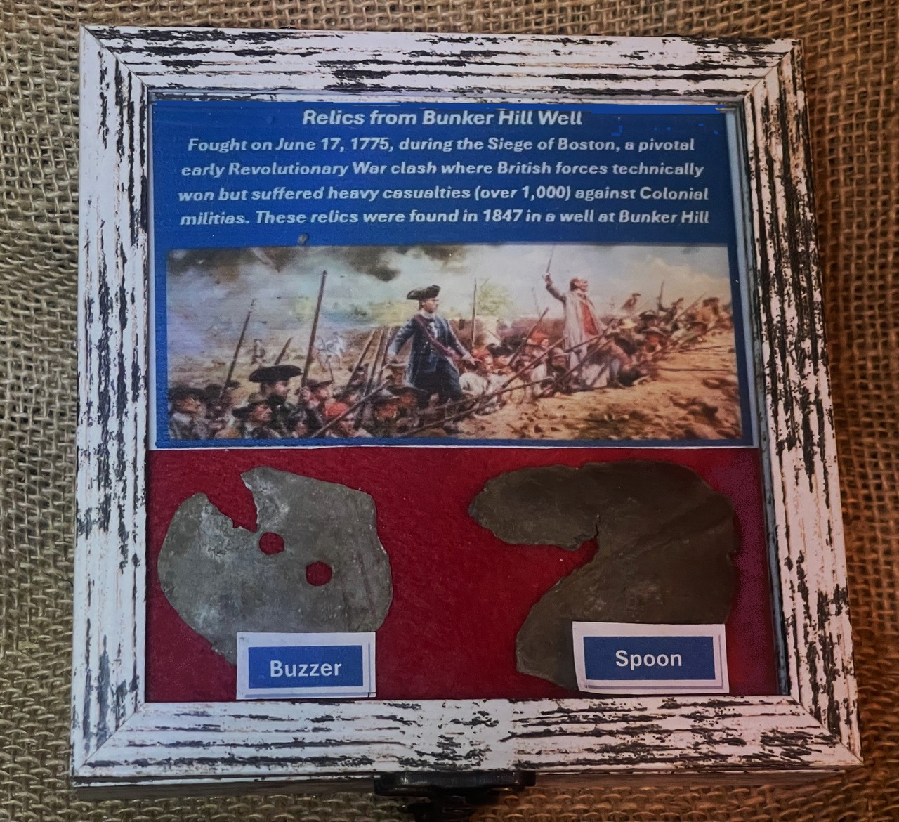 Along with this COA is a signed and embossed Bunker Hill emblem and a copy of the original newspaper clipping of the 1847 event. Any documented relics from Bunker Hill are just about impossible to find today. They come in the display case pictured.