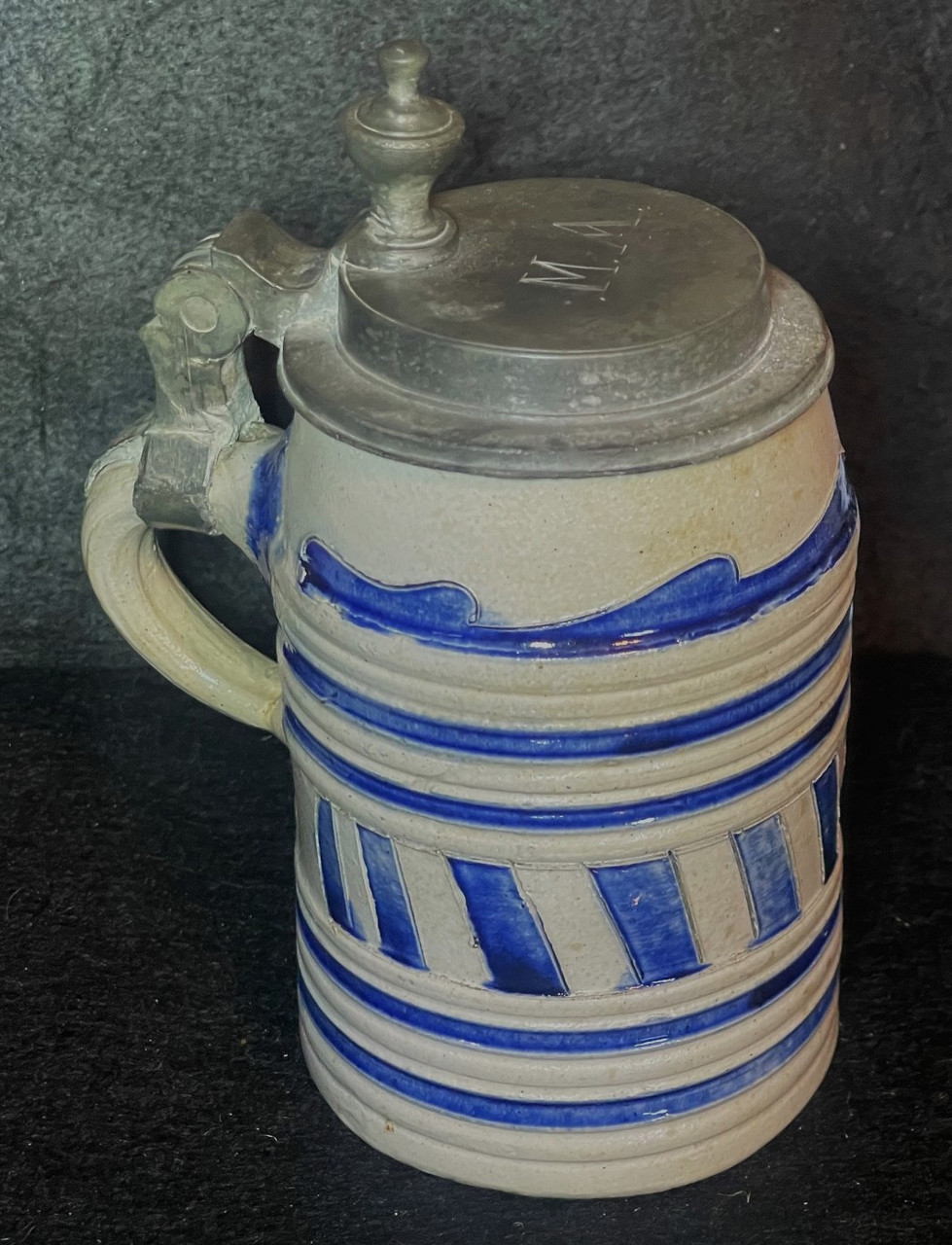 Being offered is an 18th century Westerwald Tavern Stein. It has the pewter flip-top lid and measures 6” to the top pewter finial of the lid and has a diameter of 3”. Engraved on the pewter lid, probably by a jeweler, are the letters “M A”, probably the original owner. This unique tankard came out of a 1700s tavern in upstate New York.