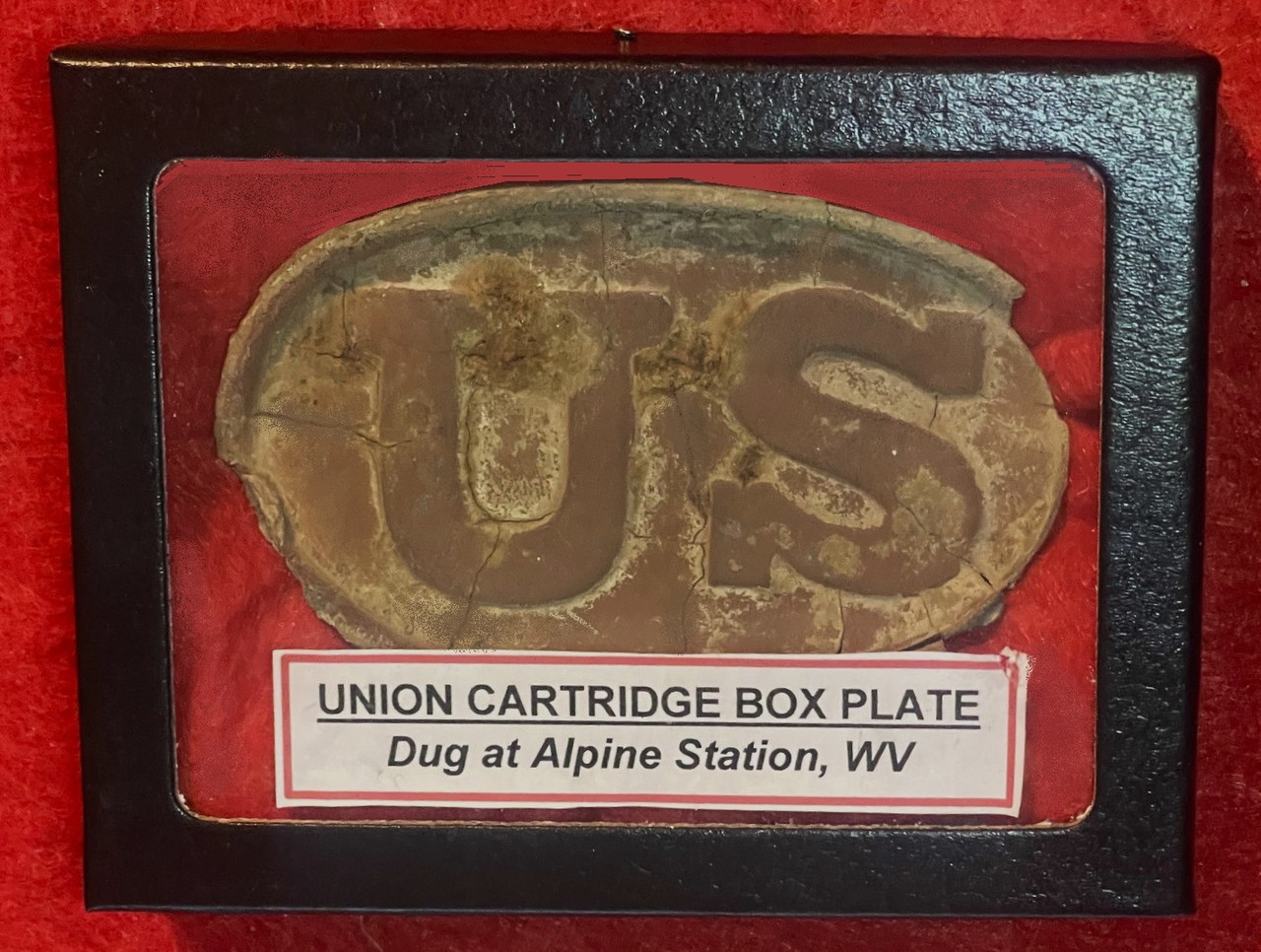 The plate is slightly concave, but the “US” really stands out – it also has a great untouched patina, and solid. There are very few relics coming from Alpine Station, and this is the first one I had. It comes in the glass top display case pictured.