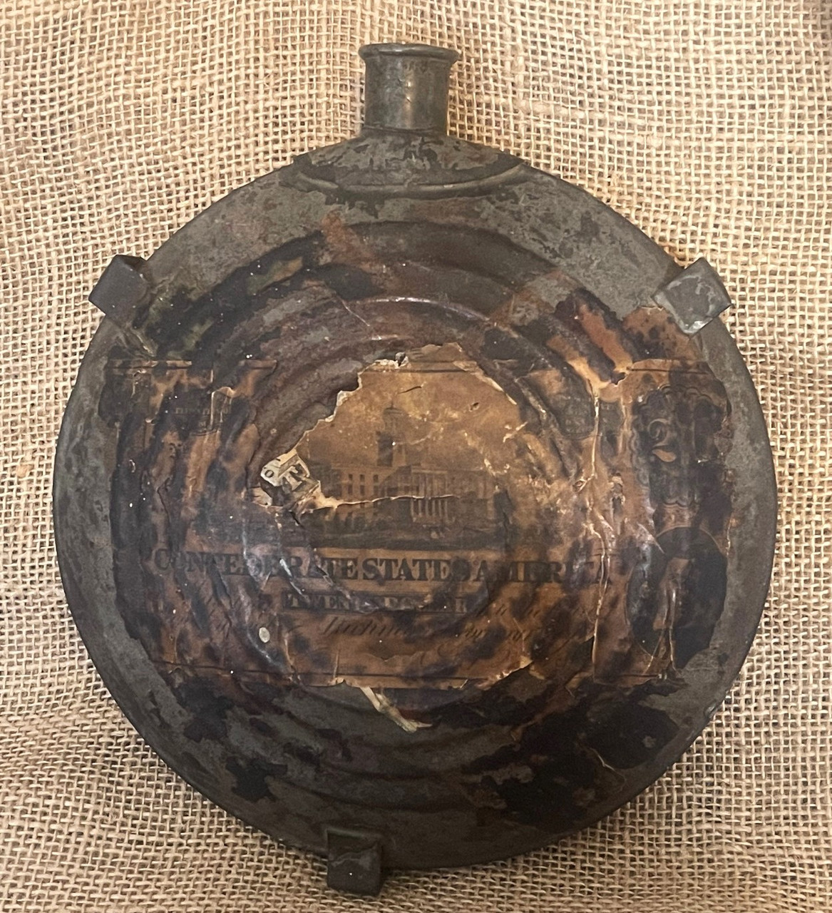 This is a very unique piece being offered from the large canteen collection I acquired. It is a regulation Union "Bullseye" canteen and glued to the front of it is an 1862 Confederate $20.00 bill. Also, you can see a small piece of a $10.00 bill under it.