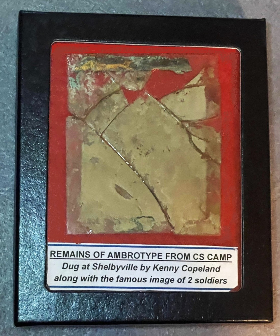 This item was dug with the very famous ambrotype of two Louisiana soldiers. The notable ambrotype is pictured in Steve Mullinax's Confederate Buckle Book and Charles Harris Civil War Relics of the Western Campaigns books (see pictures) . When Ken dug it, it still had a very clear image, so clear that you could see the Pelican Buckles and buttons on their uniforms.