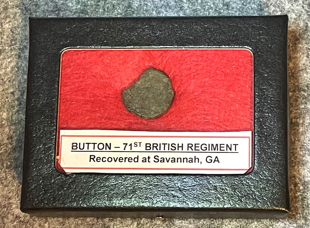 This is one of those Revolutionary War buttons that are almost impossible to find. It is an 18mm pewter button, having the faint “71” on the face, from a non-officer member of Britain's 71st Regiment of Foot, popularly known as "Fraser's Highlanders." This distinguished British regiment was raised in Scotland in 1775 to fight in the American Revolution. It was recovered with another one in Savannah, Georgia.